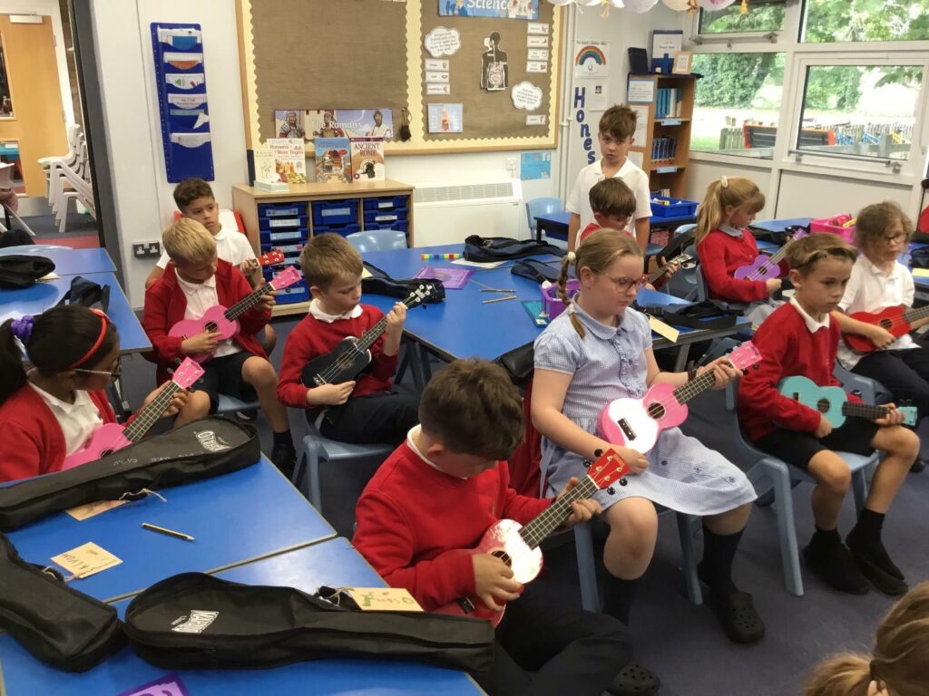 Leicestershire Music Services come and give Ukulele lessons to Year 4 every week. Some children continue with these lessons into years 5 and 6.